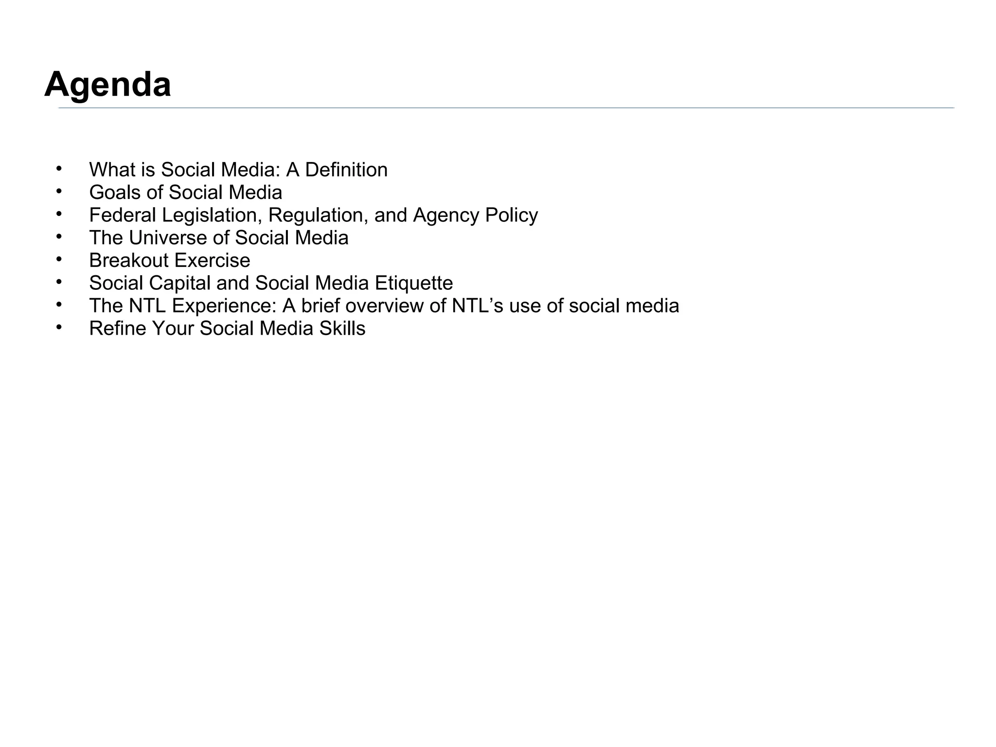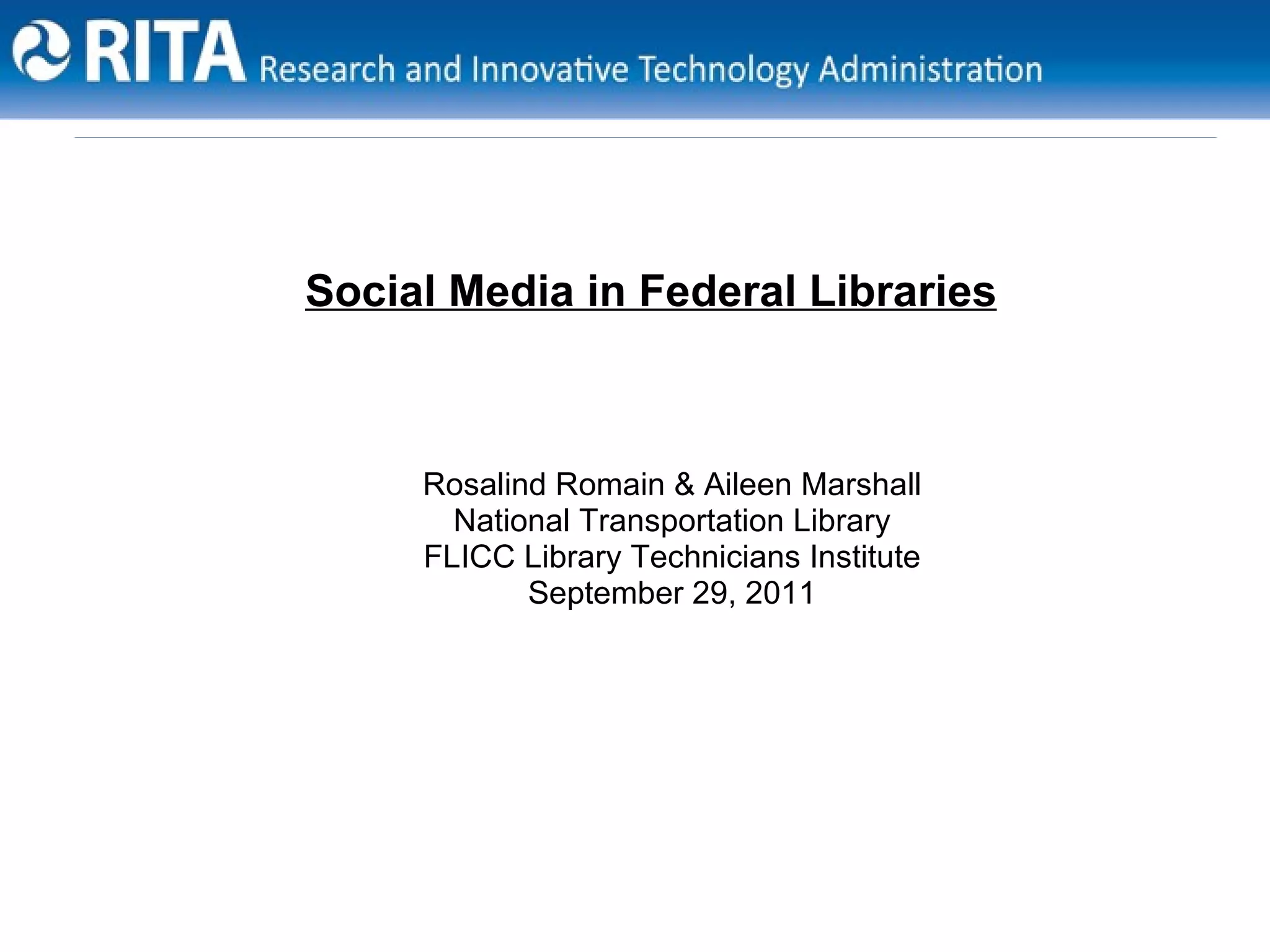 This document discusses social media use in federal libraries. It begins with definitions of social media and describes common goals of using social media such as reaching new audiences and increasing awareness of library resources. It also covers federal policies and guidelines regarding social media use. The document then provides examples of different types of social media tools or platforms including social networks, microblogging, RSS feeds, social bookmarking, wikis, photo/video sharing, blogs, and more. For each it gives the definition and examples of federal libraries using that tool. The goal is to help libraries understand how to develop a social media strategy and presence.