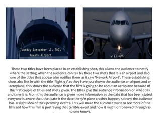 The film begins with titles appearing on a black background to introduce the production team. The last title, "flight 93", indicates the film will focus on this event and provides context without distracting visuals. Establishing shots of an airport and plane introduce the setting as Newark Airport on September 11th, signaling the film will depict that day's airplane crashes. Subsequent titles reveal characters' names in shots of the actors, identifying main characters like Jeffrey Nordling who plays Tom. Credits for lesser roles fade over unimportant scenery.