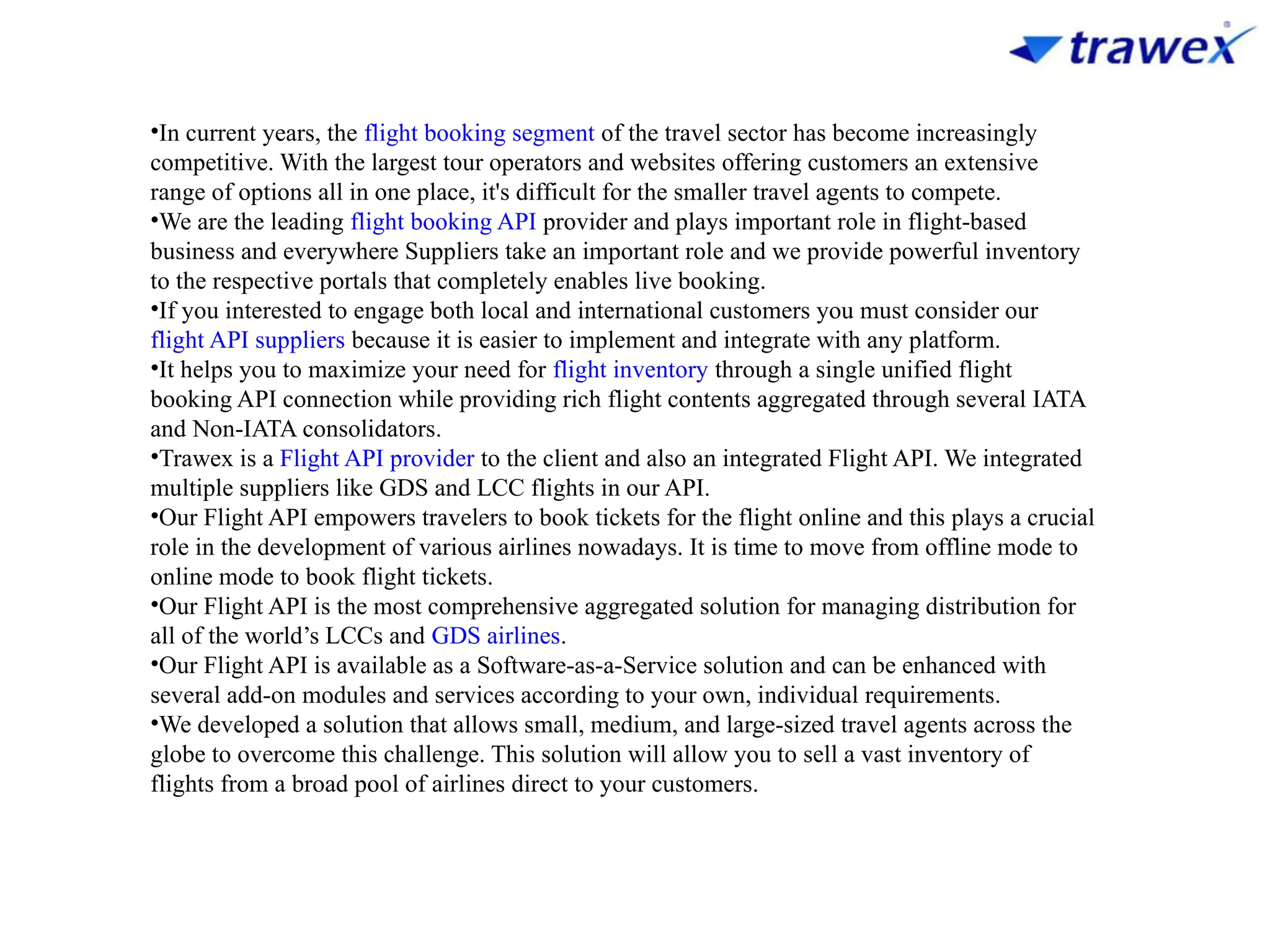 Trawex is a Flight API provider to the client and also an integrated Flight API. We integrated multiple suppliers like GDS and LCC flights in our API. Our Flight API empowers travelers to book tickets for the flight online and this plays a crucial role in the development of various airlines nowadays. It is time to move from offline mode to online mode to book flight tickets. Our Flight API is the most comprehensive aggregated solution for managing distribution for all of the world’s LCCs and GDS airlines. At Trawex, when we provide you with access to our flight API, and once it is integrated into your website, it will allow your customers and your business access to a great variety of services. For more details, Pls visit our website: https://www.trawex.com/flight-api-provider.php