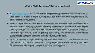 Trawex provides a flight booking API that allows travel businesses to integrate flight booking features into their platforms, enabling customers to search and book flights efficiently while accessing real-time pricing and availability. The API enhances user experience through customizable booking processes and advanced technology for instant confirmations and real-time updates. Trawex's integration services help businesses reduce operational costs, streamline booking processes, and improve customer satisfaction with features like ancillary services and secure payment processing.
