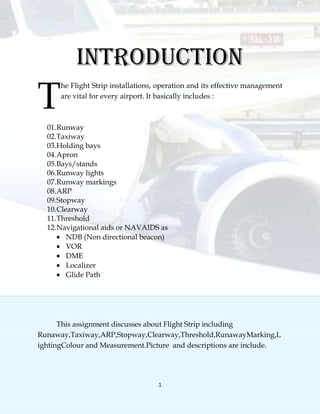 This document discusses various aspects of airport flight strips, including runways, taxiways, markings, and lighting. It describes runways as the defined areas for aircraft takeoff and landing, and taxiways as the smaller paths that allow safe surface movement. It outlines the key markings like thresholds, centerlines, and designators used on runways and taxiways. It also explains the different lighting systems like approach lighting, VASI, and PAPI that aid pilots during low visibility, and specifies the colors used to identify features. Finally, it notes the importance of effective management and maintenance of these facilities to ensure safety and efficiency of aircraft operations.