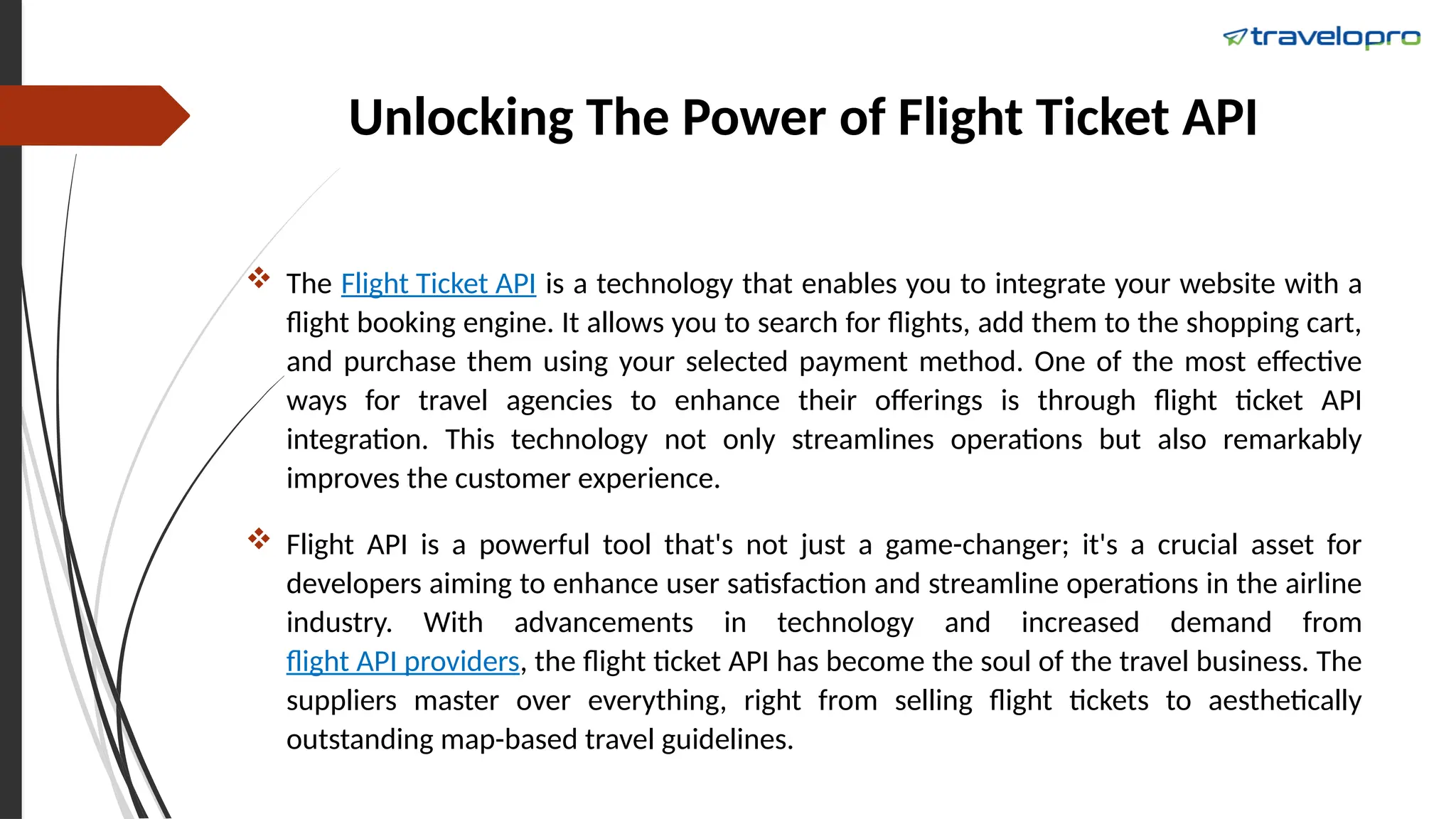 The document outlines the advantages of integrating a flight ticket API into travel websites or applications, emphasizing its role in providing real-time flight information and enhancing user experience. Travelopro is highlighted as a leading provider of flight ticket APIs that simplifies the booking process and supports developers with comprehensive solutions. Key features of the API include easy content aggregation, flexible target systems, and 24/7 support, attracting over 1000 users due to its reliability and scalability.