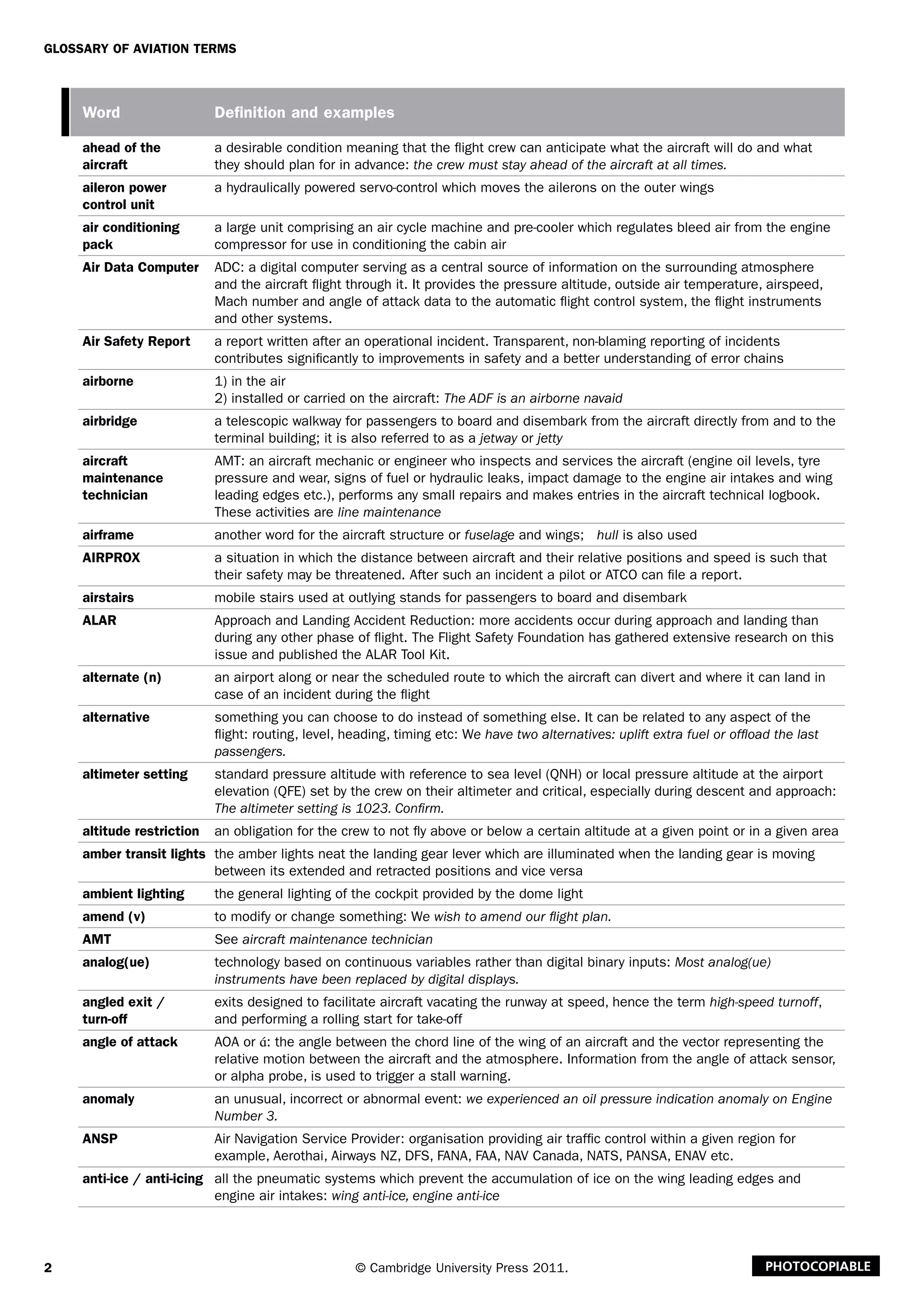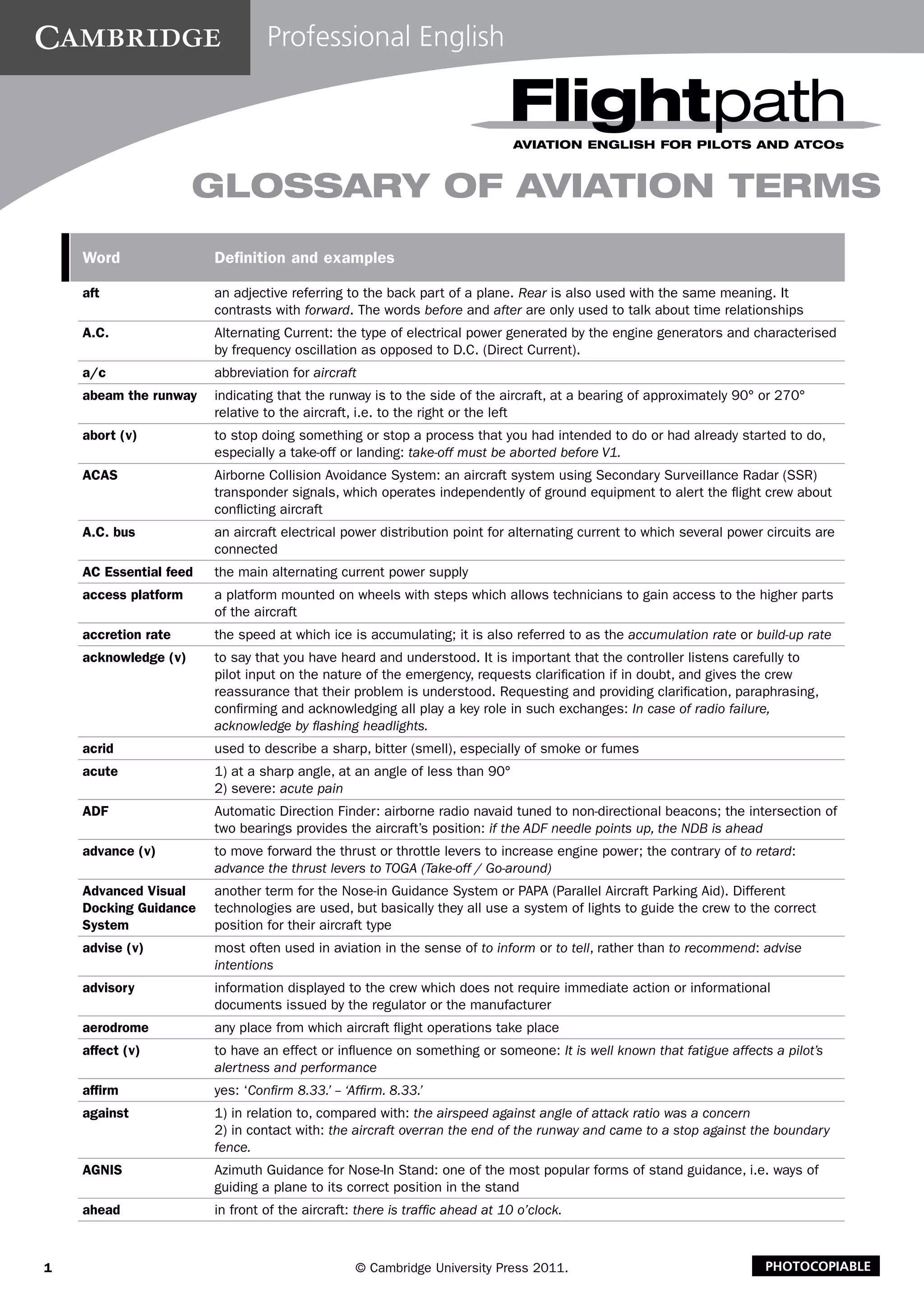This document provides definitions and examples of aviation terminology used by pilots and air traffic controllers. Some key terms defined include: aft, a/c, abort, ACAS, acknowledge, acute, ADF, advance, aerodrome, against, AGNIS, ahead, APU, arm, assigned level, asymmetry, assess, ATIS, attitude, autobrake, autoland, autopilot, autothrottle, aviation English, avoid, bearing, BECMG, below minima, best practice, bird strike, black-hole effect.