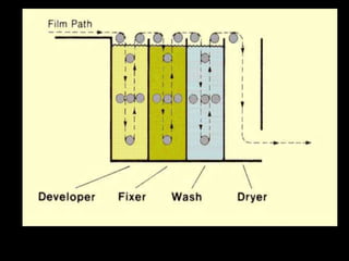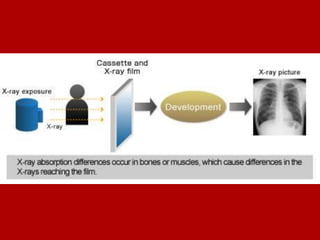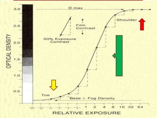 This document provides an overview of the physics of film screens used in radiography. It discusses the structure and components of radiographic film, intensifying screens, and cassettes. Intensifying screens absorb x-rays and convert them to light, which is more easily detected by the film. This increases the film's sensitivity and reduces the necessary radiation dose. The characteristic curve describes the film-screen combination's response to radiation by relating optical density to exposure. It is used to determine the film's speed, gamma, latitude, and fog level. Intensifying screens allow lower radiation doses to produce diagnostic images compared to film alone.