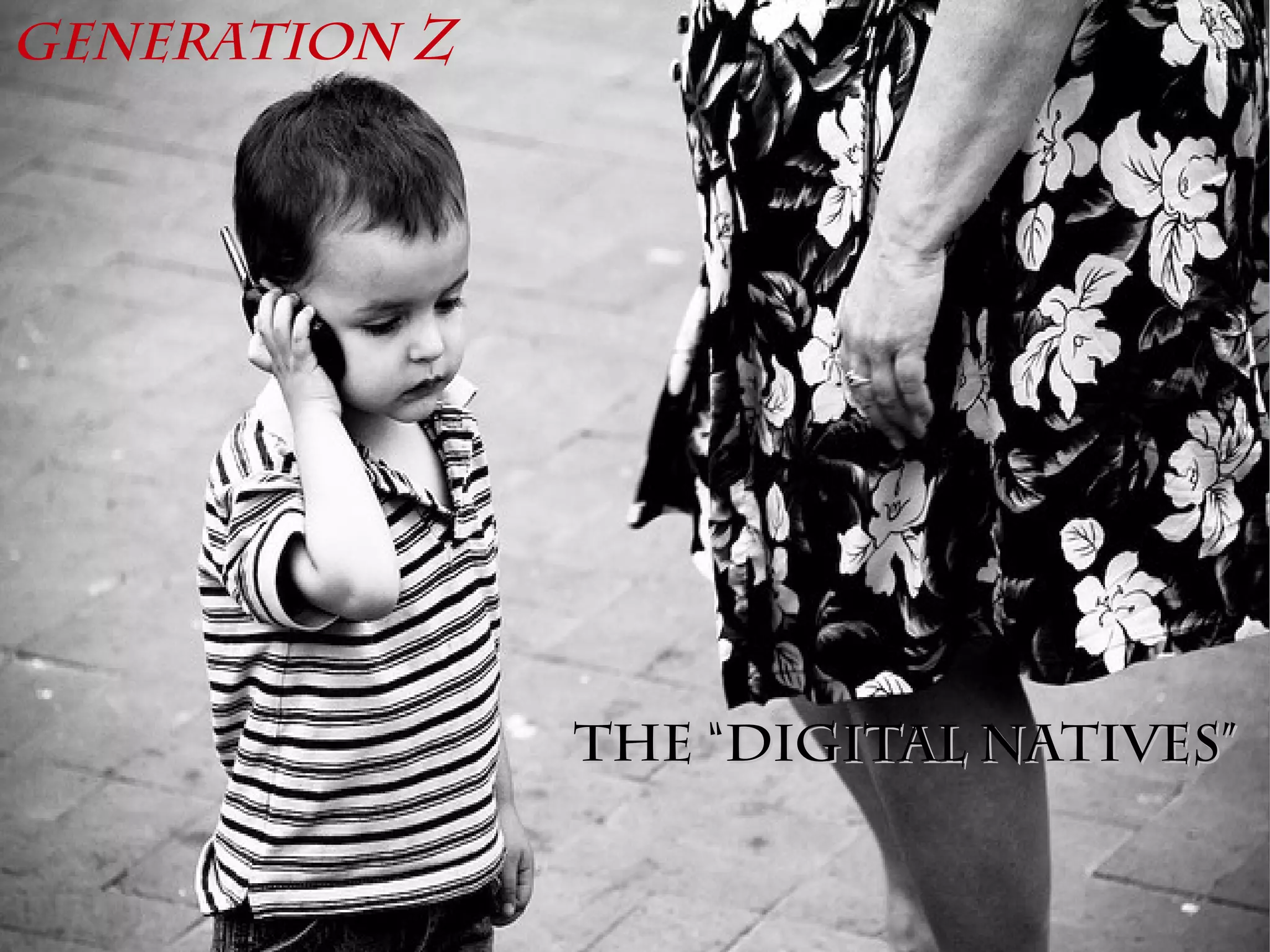 Generation Z refers to children born in the digital age who are native users of technology. They are being introduced to technology like computers and mobile devices at earlier ages in schools and their daily lives. While technology provides educational benefits, it can also distract from traditional forms of learning and human interaction. As technology becomes more ingrained in society, this generation's relationship with and dependence on devices will be shaped by how parents teach them to utilize technology effectively.