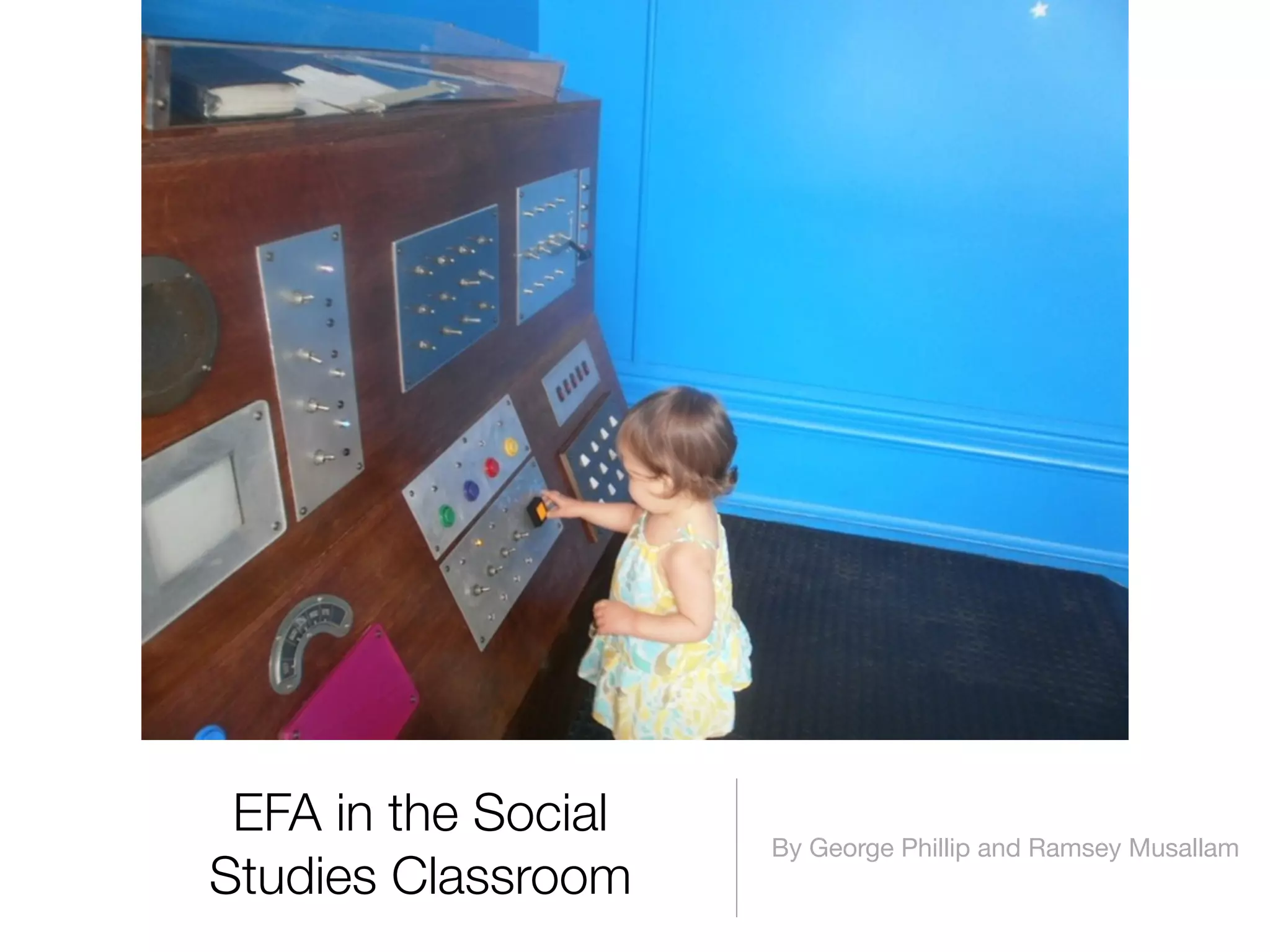 This document discusses the Explore-Flip-Apply (EFA) instructional model for social studies classrooms. It provides examples of lessons using EFA with topics like early African civilizations, Chinese history, and global warming. EFA lessons typically start with an "Explore" activity using sources like videos, maps, or primary sources to engage students. This is followed by students "Flipping" their learning outside of class, such as watching a video for homework. In class, students then "Apply" their knowledge through activities like analyzing sources, debates, or creating presentations. The goal is for students to take ownership of their learning through active participation.