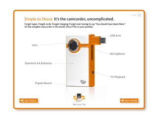 This document provides instructions for using basic functions on a Flip video camera such as playing, recording, zooming, adjusting volume, deleting videos, and transferring videos to a desktop computer. It also provides information on downloading Flip software to edit and manage videos on a computer. The software can be downloaded automatically by inserting the camera into the computer or manually from the Flip website.
