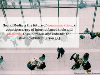 The document discusses the impact of social media on youth. It notes that nearly half the world's population is online and over two-thirds of online users engage with social media. For youth, social media is integrated into their daily lives and they tend to be early adopters of new technologies. While social media can positively impact education and friendship building, it can also increase risks like cyberbullying, oversharing of private information exposing youth to identity theft, and excessive use reducing real-world social skills. Both benefits and dangers of social media should be considered for youth.
