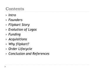 Flipkart was founded in 2007 by Sachin and Binny Bansal to sell books online. It has since expanded into various product categories. Flipkart raised funds and acquired other companies to grow. It focuses on selection, payments, delivery, and returns to provide customers a good shopping experience. Flipkart aims to attract and retain customers through its services as online retail in India continues to grow substantially.