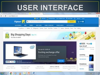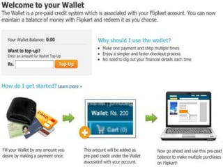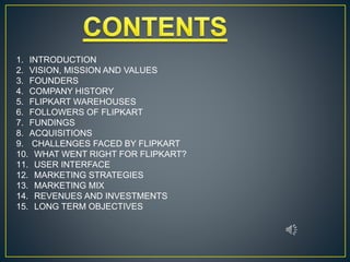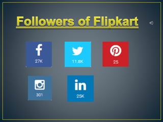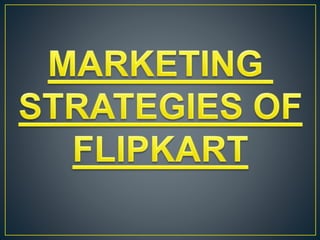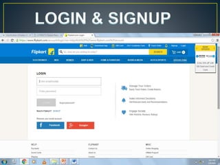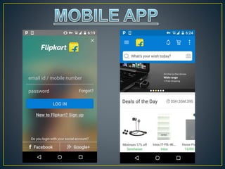 Flipkart was established in 2007 by IIT alumni Sachin Bansal and Binny Bansal. It initially sold books online and has since expanded into various product categories. Flipkart has raised over $3 billion in funding and acquired companies like Myntra. It focuses on strong logistics and customer service to compete with Amazon in India. Flipkart's vision is to become the largest online retailer in India across all categories except groceries and automobiles.