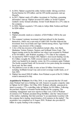 Flipkart is an Indian e-commerce company founded in 2007 and headquartered in Bangalore. It initially focused on online book sales before expanding into other products. In 2018, Walmart acquired a 77% controlling stake in Flipkart for $16 billion. Flipkart generates revenue through commissions from sellers, logistics fees, and digital advertising. It has grown significantly through partnerships and acquisitions to become the dominant online retailer in India.