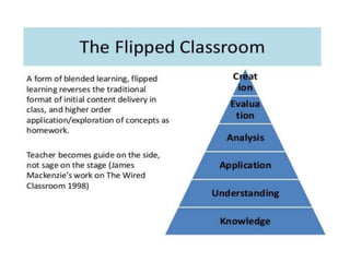 The document discusses flipped classroom and blended learning models. It defines flipped classroom as transferring work outside of class like watching lectures, and using class time for hands-on activities and practice. Blended learning combines online and in-person learning, where students may learn content both online and in class. The document describes six blended learning models: Station Rotation, Lab Rotation, Individual Rotation, Flipped Classroom, Flex, and A La Carte. These models vary in how students access online content and receive support from teachers.
