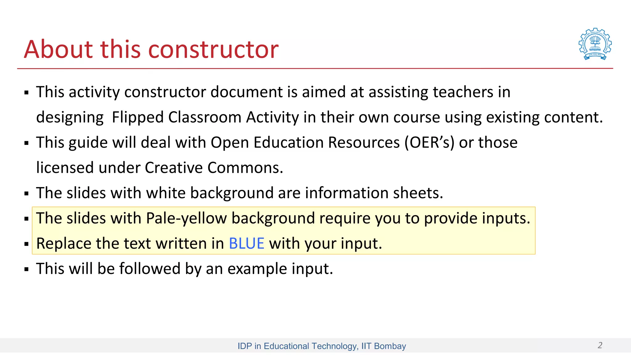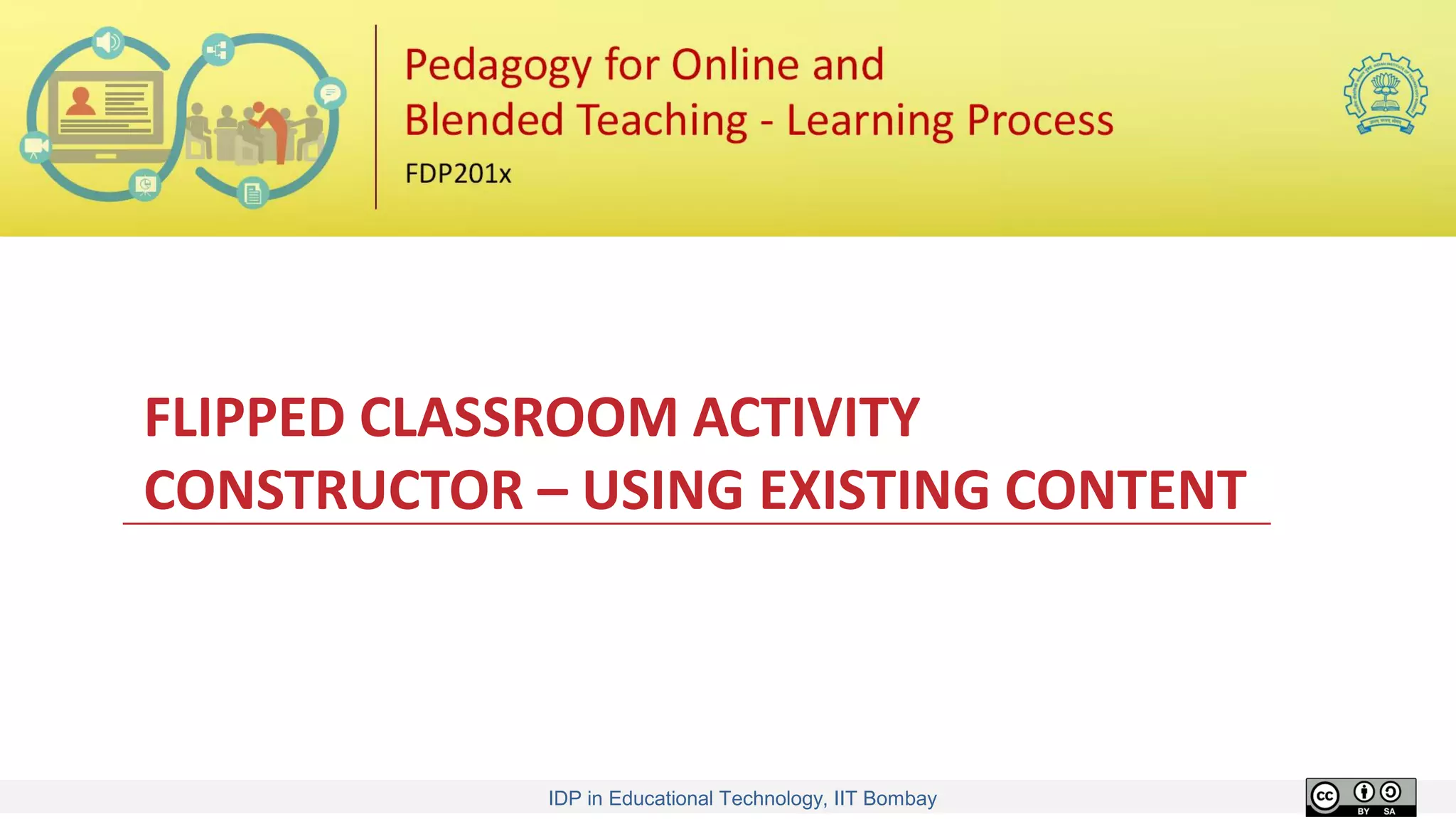 The document provides guidance for teachers on designing flipped classroom activities using existing educational content. It discusses key aspects of out-of-class and in-class activity design for a flipped classroom approach. For the out-of-class segment, it recommends identifying learning objectives and key concepts, locating relevant open educational resources for students, and designing assessments aligned to the learning objectives. For the in-class segment, it suggests engaging students in active learning strategies like think-pair-share and peer instruction that involve higher-order thinking and feedback. Examples are provided for how to structure different parts of the flipped classroom activity design.