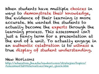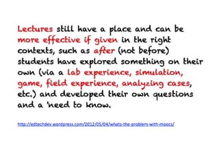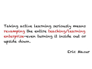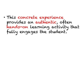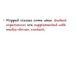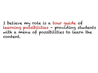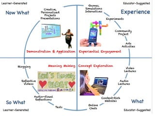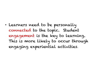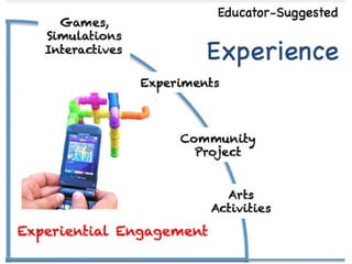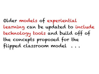 The document contains a collection of online resources, tools, and strategies for enhancing learning experiences through various methods such as flipped classrooms, virtual field trips, and experiential education. It highlights the significance of applying learned concepts and encourages educators to explore diverse learning styles. Additionally, it emphasizes the potential impact of educators in shaping positive change within the learning community.
