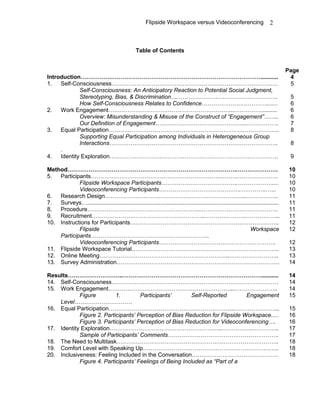 This document compares the user experiences of the Flipside Workspace (FW) online collaboration platform versus traditional videoconferencing (VC). It aims to explore how each platform impacts factors like self-consciousness, work engagement, equal participation, and identity exploration. The document provides background information on these factors and how they relate to improving online collaboration. It then describes the methodology used in a pilot study comparing FW and VC users across these factors through surveys. Key results found that FW reduced self-consciousness and increased perceptions of equal participation compared to VC. The document discusses implications and suggestions for future research.