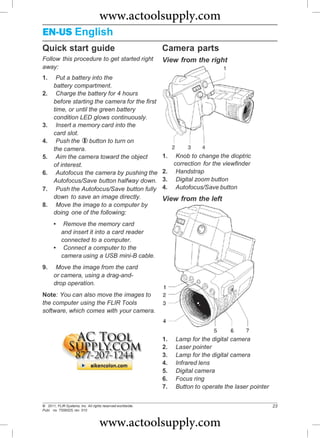 This document provides instructions for using FLIR T-Series infrared cameras. It includes a quick start guide that outlines the basic steps to take an image with the camera. It then describes the camera parts such as buttons and lenses. It also shows how to connect external devices and storage media. The document provides tips for using the camera and removing parts like the battery and lenses.