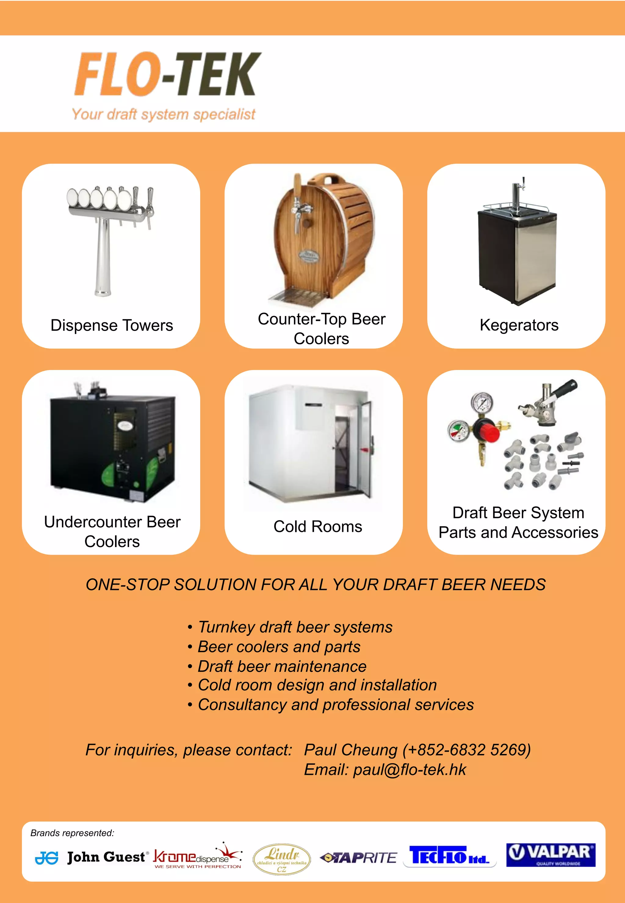 The document provides information on beer dispense equipment from a company called Flo-tek, including beer coolers, draft beer systems, beer towers, kegerators, and parts and accessories. It lists specifications and features of various beer cooler models from the brand Lindr and provides contact information for inquiries.