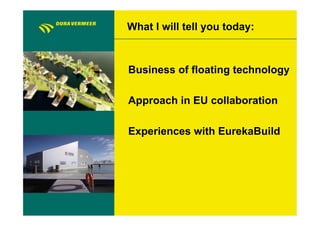 This document summarizes a presentation about floating technology and experiences with the EurekaBuild collaboration. It discusses the business case for floating structures in applications like flood protection in Rotterdam, greenhouses, infrastructure, and the Maldives. Technological objectives include increasing buoyancy and stiffness while reducing costs. The FLOATEC process aims to create lightweight, modular floating structures adapted to business needs. While EurekaBuild provided a vehicle for collaboration, differences in partner interests and commitments as well as less structured processes were challenges. Recommendations include cultivating strategic alignment among partners and better process management.