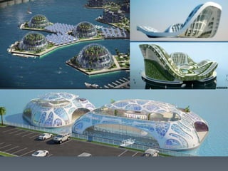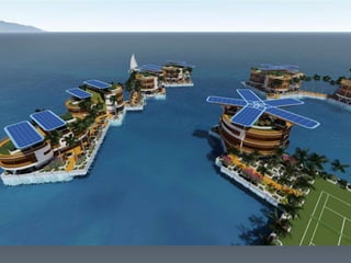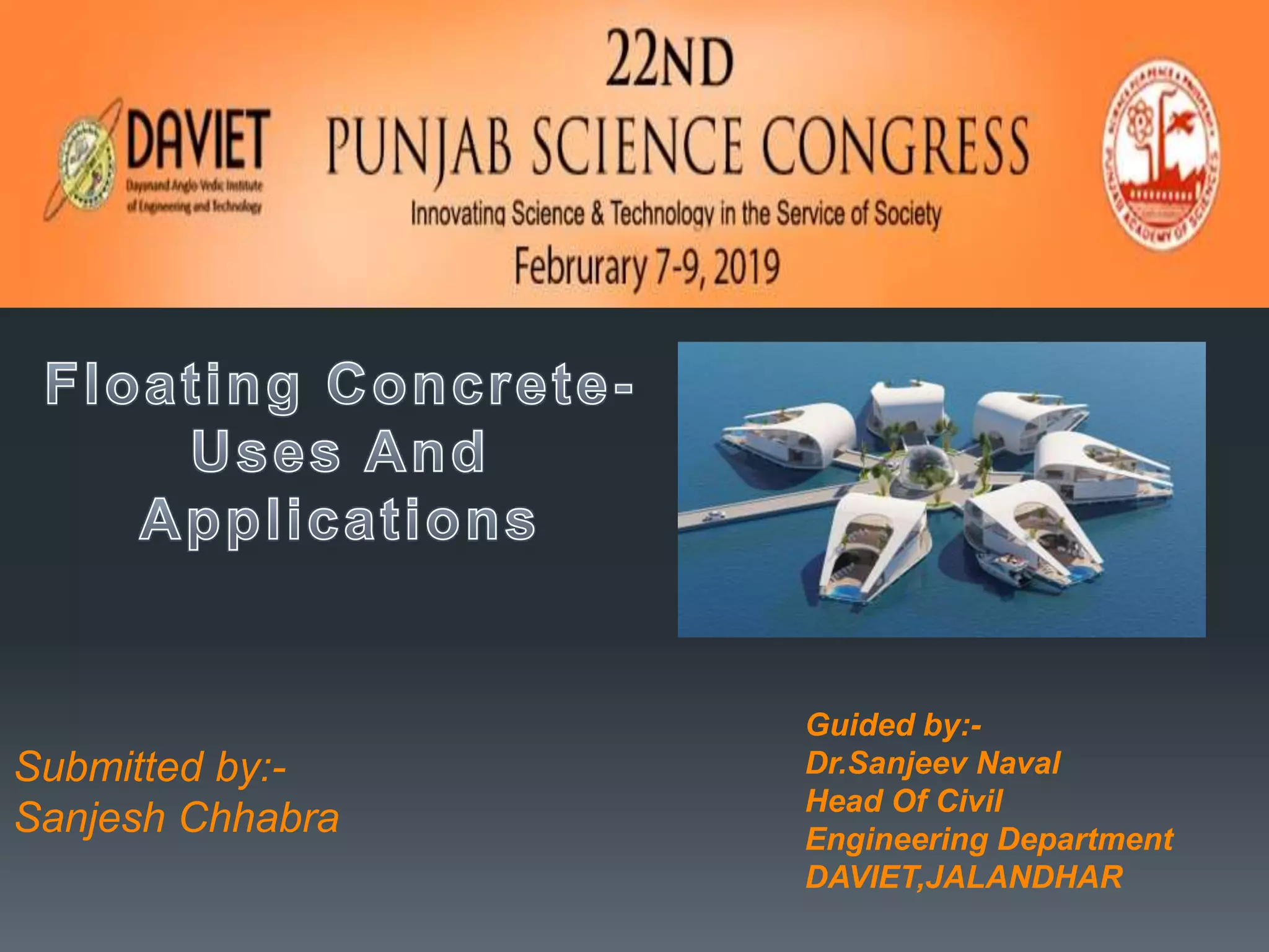 This document discusses the materials and properties of floating concrete. It proposes using aluminum wire mesh or carbon fiber mesh in place of steel wire mesh to reduce weight. Lightweight aggregates like pumice stone are suggested. Aluminum powder and calcium chloride are used as admixtures to create air pockets and shorten setting time. Nano-silica is added to improve strength. Waterproofing agents are needed since porosity should be near zero. The concrete has lower density, is insulating, workable, durable, and earthquake resistant but has less compressive strength than regular concrete. Skilled labor and certain conditions are limitations.