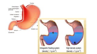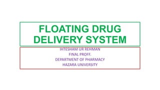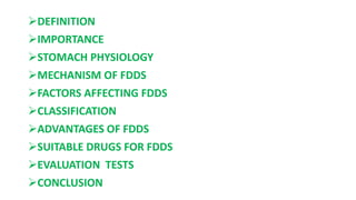 This document discusses floating drug delivery systems (FDDS). It defines FDDS as systems that have sufficient buoyancy to float over gastric contents and remain in the stomach for a prolonged period of time. This results in increased gastric retention and better control of drug concentrations. The document covers the importance of FDDS, factors affecting performance, classifications, suitable drugs, evaluation tests, and examples of marketed products. It provides details on the preparation and functioning of various FDDS types including non-effervescent, effervescent, raft forming, and hollow microspheres.