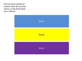 This document discusses applying CSS styling to three content blocks. Block1 is floated left and its width is set to 300px. While the blocks themselves do not change shape, the content wraps around the floated block. Padding is then added to Block3 to prevent its text from wrapping around the overlapped Block1.