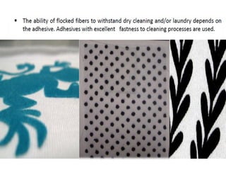 The document details the flocking process, which involves applying fine fiber particles onto surfaces to enhance aesthetics, functionality, and texture. It describes various methods of flocking, including electrostatic application and traditional adhesives, along with the types of materials used, such as natural and synthetic fibers. Additionally, it highlights the applications of flocking in industries like textiles and automotive, as well as the resurgence of interest in flocking techniques for decorative purposes.