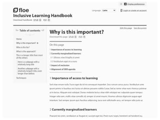 The document discusses making open educational resources (OERs) more flexible and inclusive. It argues that most current OERs focus on polished delivery rather than learner engagement, use inflexible formats, and do not support peer learning or translation. The document proposes a model called "one size fits one" that customizes content to individual learner needs and preferences through teaching inclusive design, transforming content, and augmenting OERs with tools for contributions and choosing customized versions.