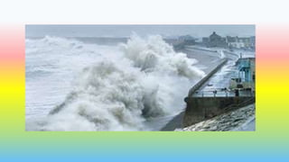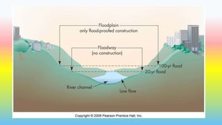 The document discusses different types of floods including coastal, riverine, and surface floods. It provides details on the causes of flooding in India such as heavy rainfall, cyclone, inadequate drainage, and deforestation. The impacts of floods include loss of lives and property, loss of livelihoods, decreased economic growth, and long-term psychological effects.