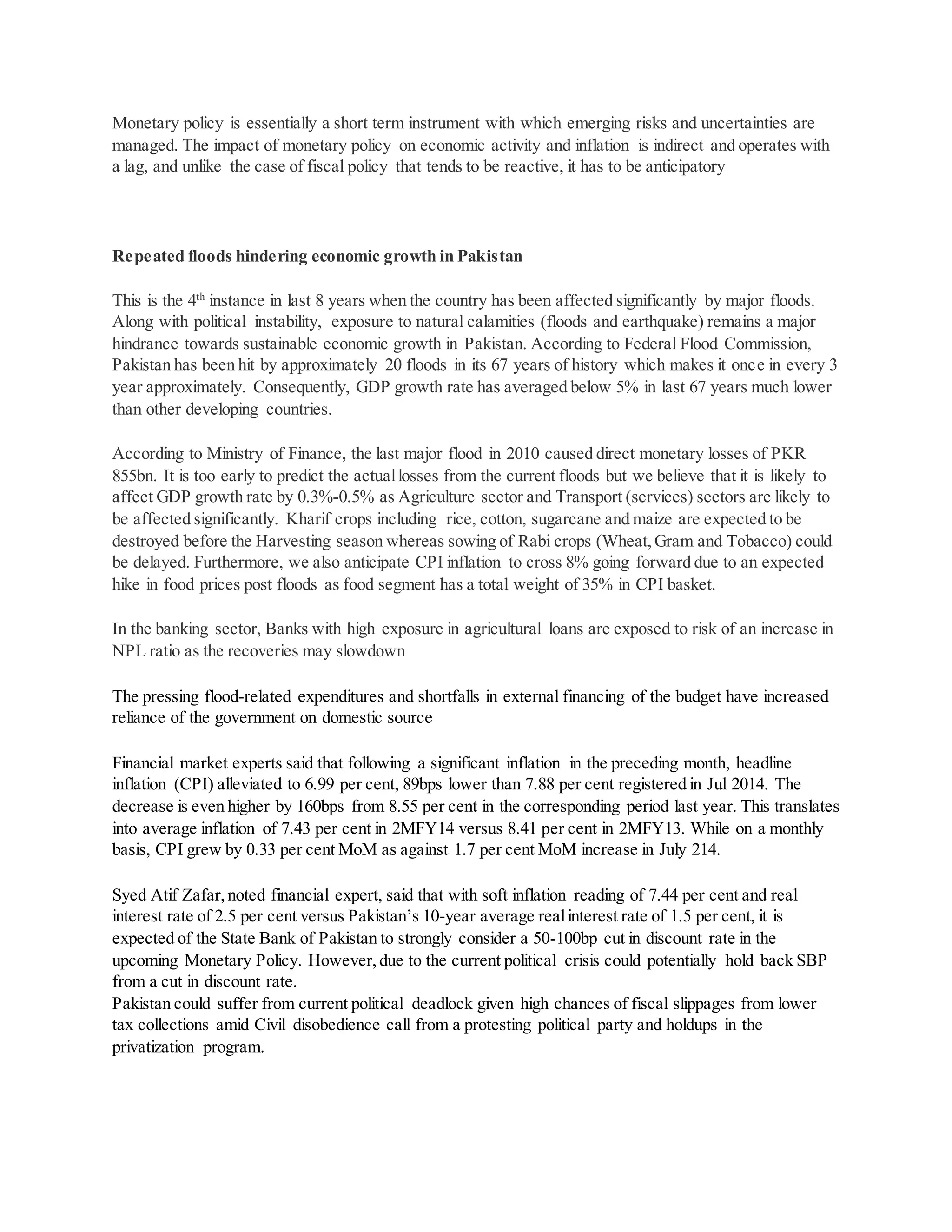 Repeated floods in Pakistan over the last 8 years have significantly hindered the country's economic growth. Pakistan experiences major floods on average once every 3 years, causing GDP growth to average below 5%, lower than other developing countries. The most recent floods in 2010 caused direct monetary losses of PKR 855 billion and will likely reduce GDP growth in the current year by 0.3-0.5% due to damage to agriculture and transport sectors. Inflation is also expected to rise above 8% due to increased food prices from the floods. Banks with large agricultural loans portfolios also face greater risk of non-performing loans as recoveries may slow.
