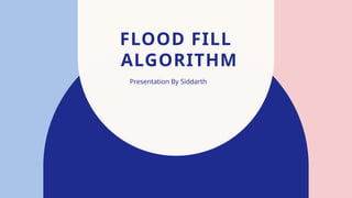 The document explains the flood fill algorithm, which fills a connected area with a specific color or pattern starting from a designated point. It details both 4-connected and 8-connected pixel scenarios and provides algorithms for both types, including examples of applications in image editing and game development. The document concludes with a specific example illustrating the algorithm's application on a matrix of colors.