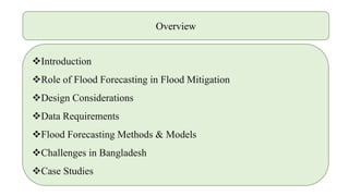The document provides a comprehensive overview of flood forecasting, its importance in flood mitigation, and the methodologies used in Bangladesh and England & Wales. It emphasizes the need for accurate meteorological and hydrological data, as well as the significance of effective dissemination of warnings to the public. Challenges such as limited resources and data quality in Bangladesh highlight the complexities of implementing effective flood forecasting systems.