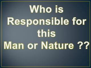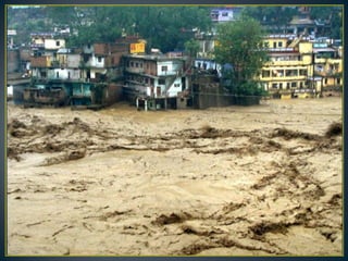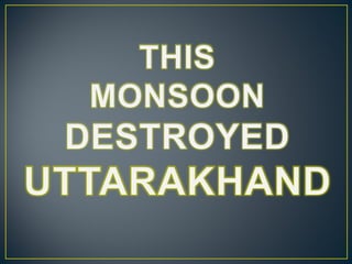 The document discusses the 2013 Uttarakhand floods in India. It provides background on Uttarakhand state and describes the heavy rainfall and landslides that occurred in June 2013, causing devastating floods. It details the response efforts, which included deployment of military personnel, rescue operations using helicopters, and distribution of relief aid. The floods caused widespread damage and many deaths and missing persons. Environmental factors like deforestation, construction of roads and buildings, and hydroelectric projects were identified as exacerbating the effects of the extreme rainfall.