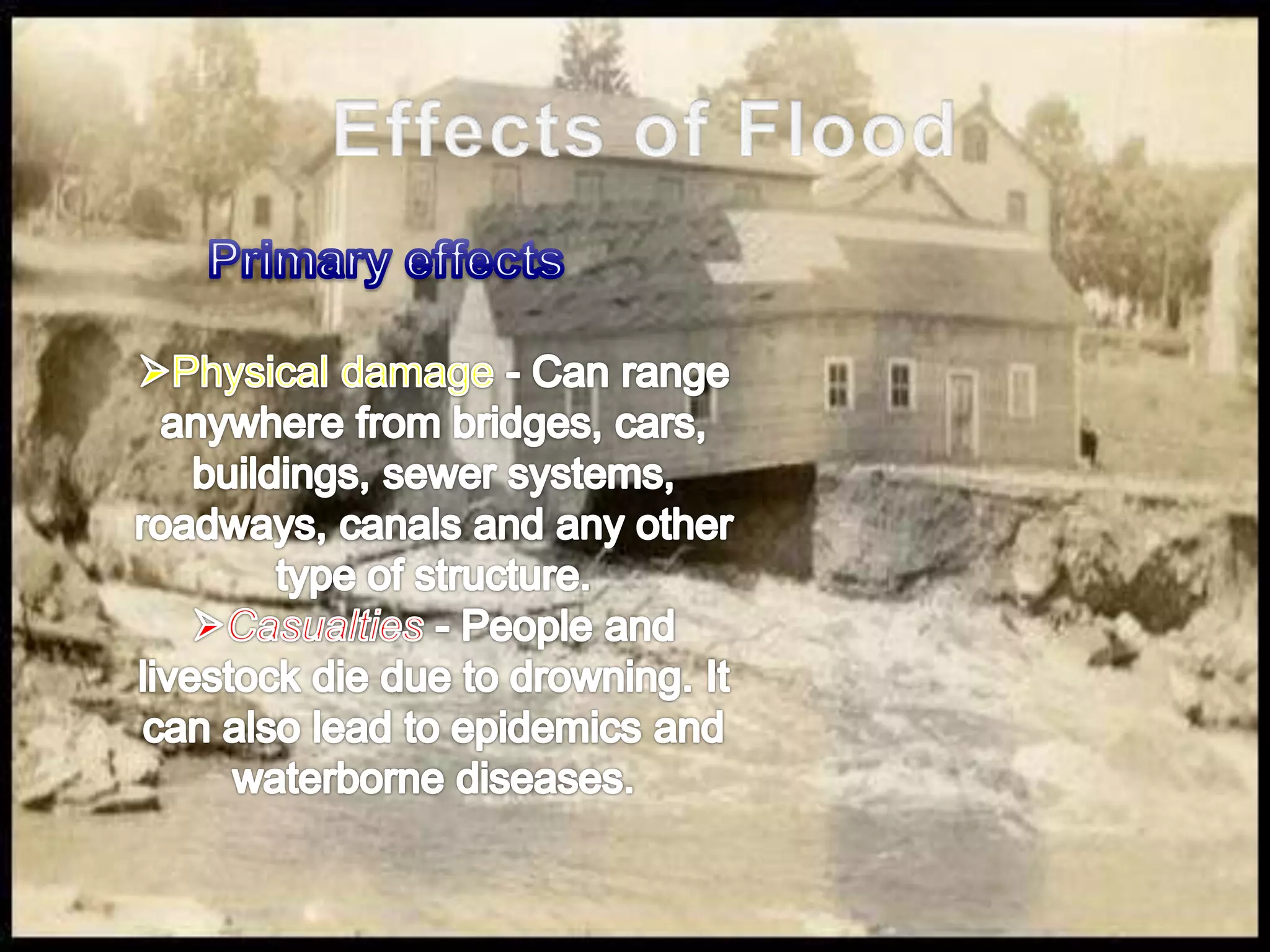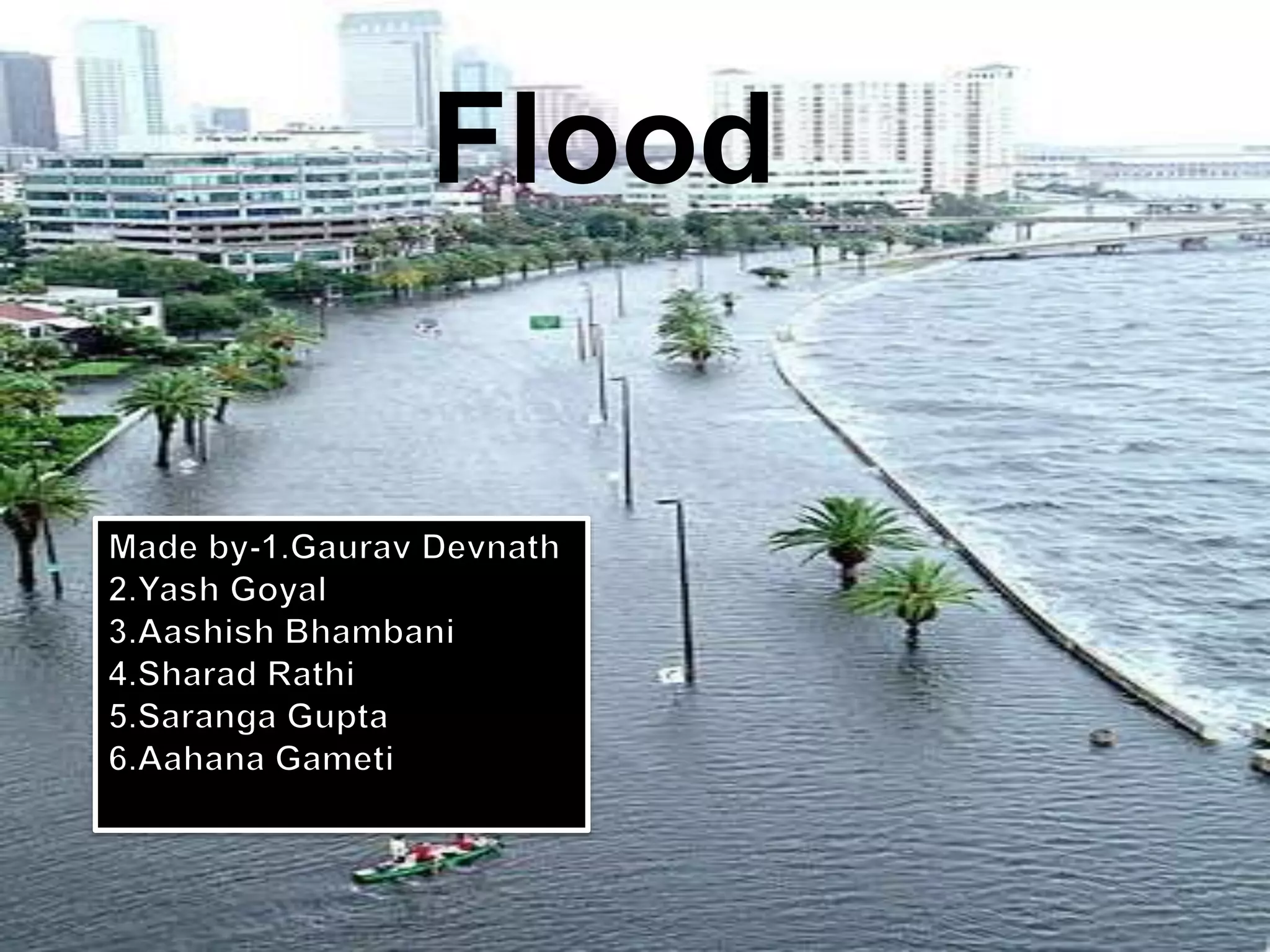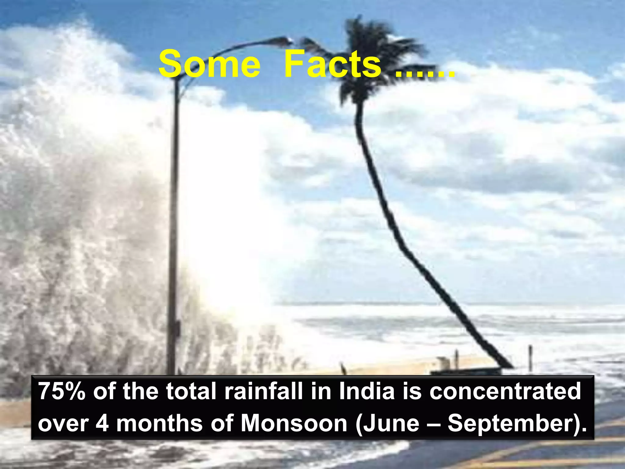 Floods are a major problem in India, affecting over 40 million hectares of land annually. The majority of rainfall is concentrated over 4 months of monsoon season, causing flooding in major river basins such as the Ganges and Brahmaputra. States like Bihar, Uttar Pradesh, West Bengal, Assam and Orissa are most at risk. Proper drainage systems and preparedness measures such as emergency supplies kits can help mitigate flood damage.