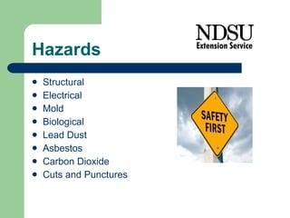 This document outlines the necessary steps for cleaning up after a flood, including safety precautions and structural evaluations. It discusses various categories of water damage, the risks associated with mold growth, and the proper methods for mold removal and restoration. The document emphasizes the importance of using appropriate personal protective equipment (PPE) and adhering to guidelines for cleaning and sanitizing contaminated areas.