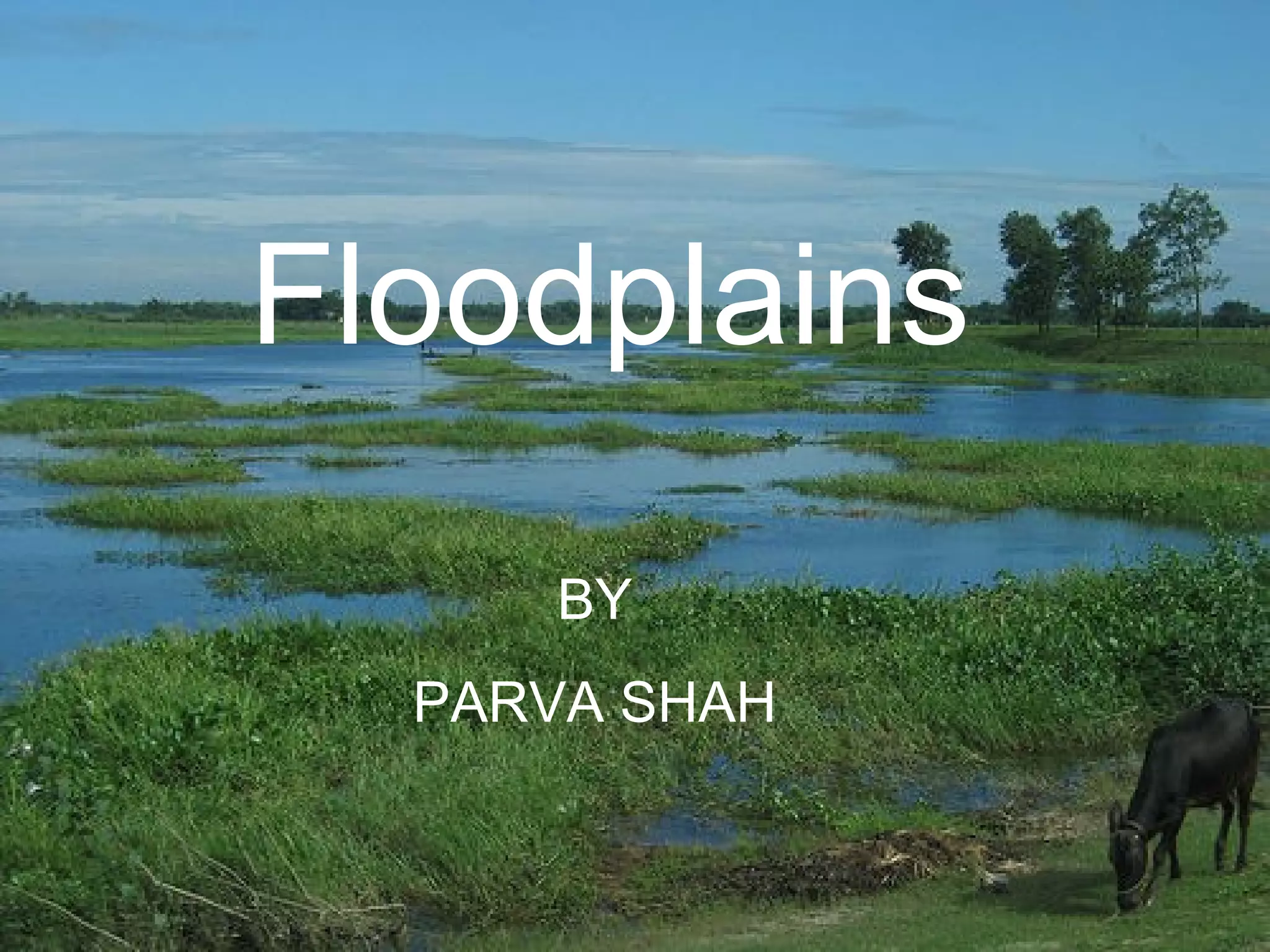 Floodplains are flat areas of land adjacent to rivers that experience occasional flooding when river discharge exceeds channel capacity. Floodplains hold excess water, allowing it to be slowly released and infiltrate while also providing time for sediment to settle. They support important wildlife habitats and are used for agriculture, recreation, and settlement due to fertile soil and access to transportation, though flooding must be controlled in urban areas through measures like levees. Floodplains form through erosion as rivers cut into channels and banks or through aggradation when sediment supply exceeds transport capacity, raising land elevation and water levels.
