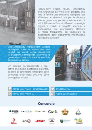 Il progetto Flood-Serv, finanziato dall'Unione Europea, mira a migliorare la gestione delle emergenze legate alle alluvioni attraverso un servizio pubblico di consapevolezza e risposta. Sfruttando tecnologie digitali, il progetto fornisce informazioni trasparenti per coinvolgere le comunità nella gestione dei rischi idrici. Una console di gestione delle emergenze integrerà dati dai social media e utilizzerà la geolocalizzazione per ottimizzare le risposte alle crisi.