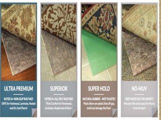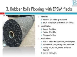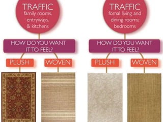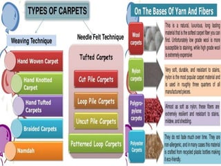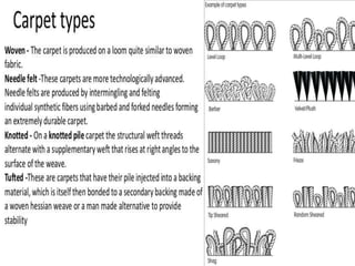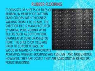 This document provides information on various types of floorings, including wooden flooring, tiles, mosaic tiles, carpets, rugs, and resilient flooring. It discusses the different types of wooden flooring like solid hardwood, engineered hardwood, and their characteristics. It also outlines the different types of tiles like ceramic tiles and mosaic tiles, and provides details on their construction, installation, advantages, and pricing. The document compares carpets and rugs, and lists the various types of each. It concludes with an overview of resilient flooring, including materials like linoleum and cork flooring.