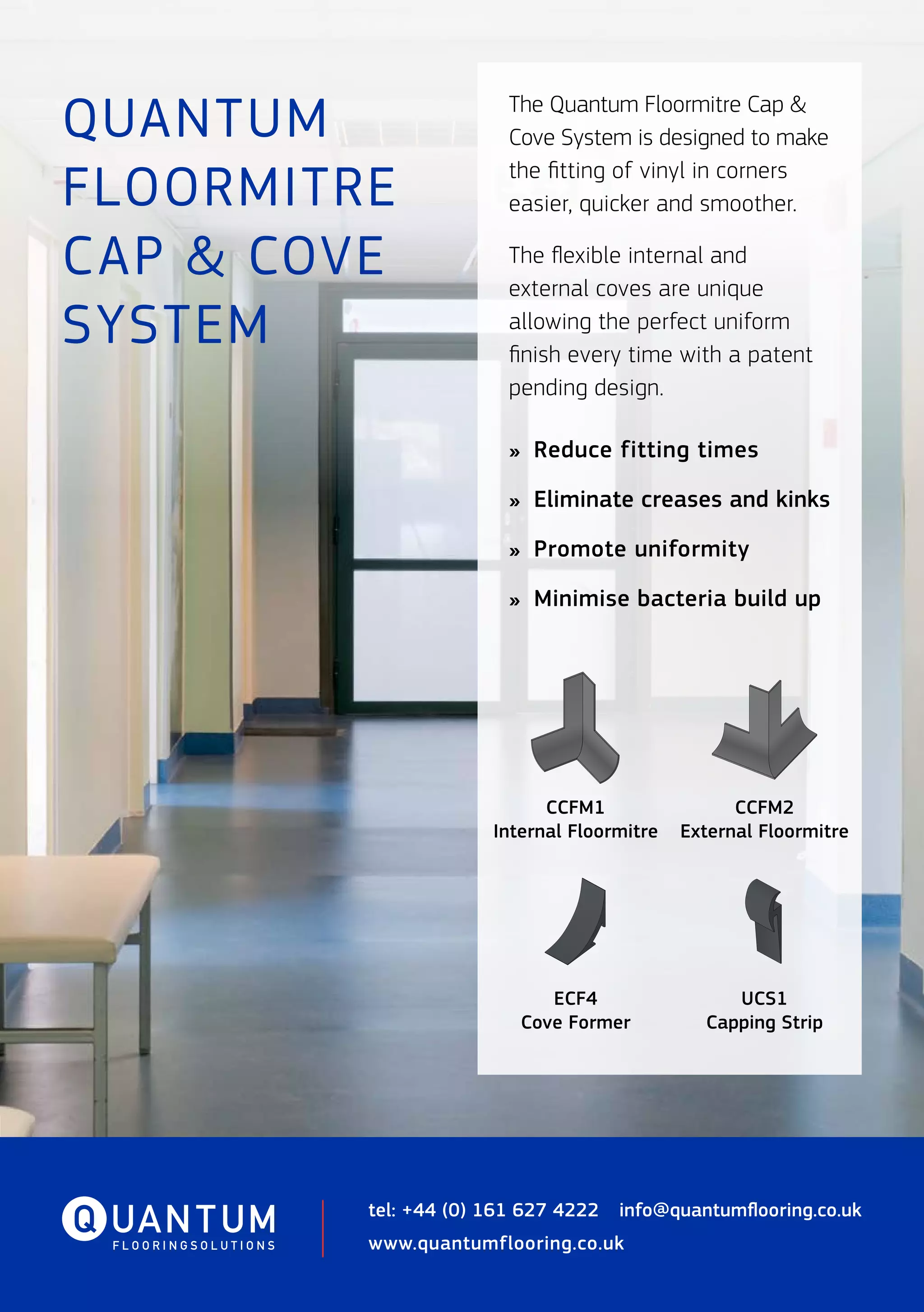 The Quantum Floormitre Cap & Cove System makes fitting vinyl in corners easier, quicker, and smoother. It uses flexible internal and external coves with a patent-pending design to provide a perfect, uniform finish. The system is designed to reduce fitting times, eliminate creases and kinks, promote uniformity, and minimize bacteria buildup.