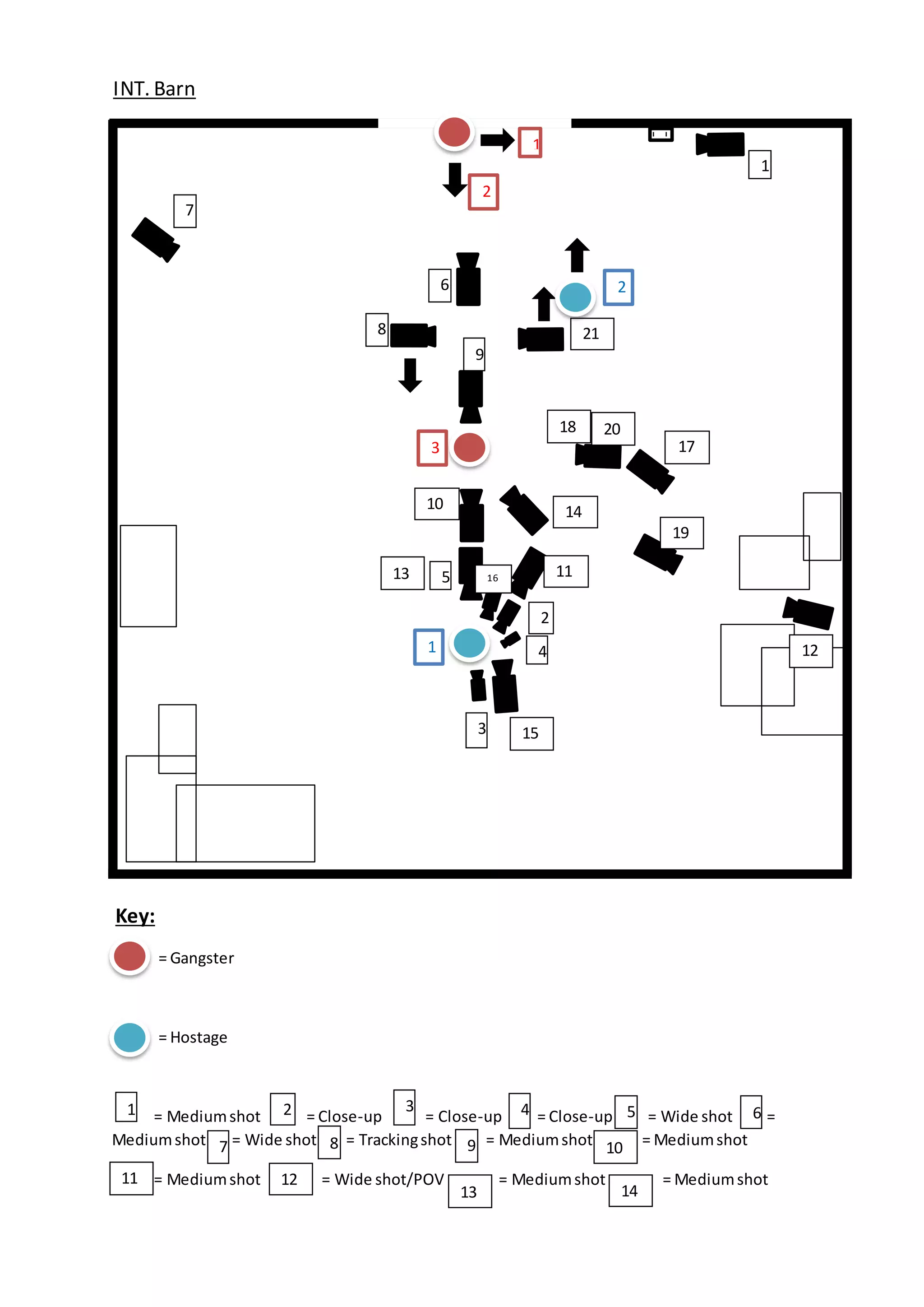 The document contains a list of camera shots and angles used in the filming of a scene involving a gangster and hostage in and around a barn. The scene is divided into three parts: shots 1-4 cover the exterior of the barn; shot 5 covers a second part of the exterior; and shots 6-9 cover a third part of the exterior. Various shots include medium shots, close-ups, wide shots, low and high angle shots, tracking shots, crane shots, and match-on-action shots to film the interaction between the characters.