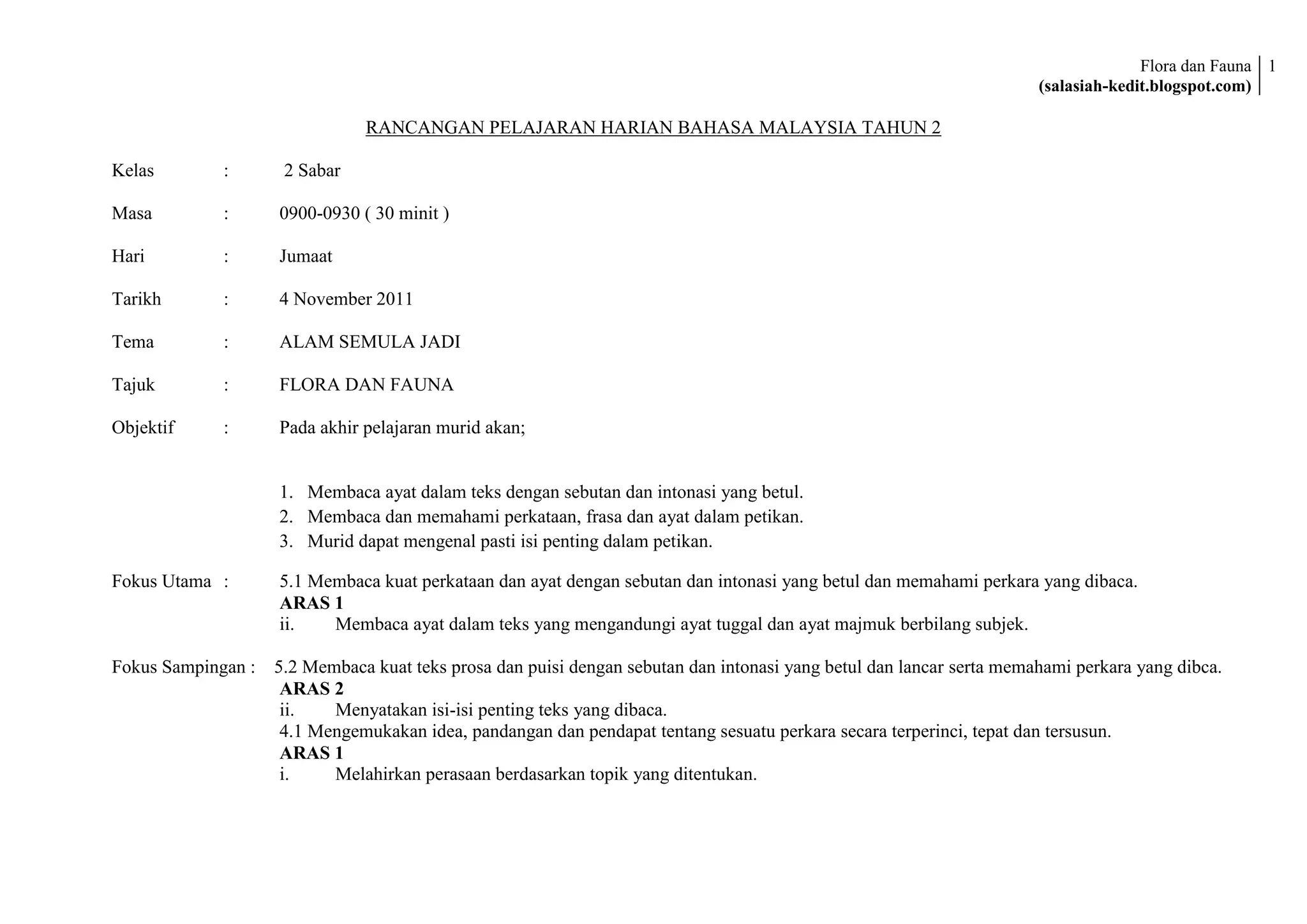 Dokumen ini adalah rancangan pelajaran harian untuk kelas Bahasa Malaysia Tahun 2 tentang flora dan fauna. Tujuannya adalah agar murid dapat membaca dengan betul, memahami teks, dan mengenal pasti isi penting. Aktiviti pengajaran meliputi membaca petikan, mengenal kata antonim, dan melengkapkan peta minda.