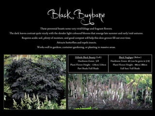 The document provides a detailed overview of various dark-colored plants suitable for different gardening conditions, including their hardiness zones, height, sun requirements, and blooming periods. Notable plants include black bugbane, zwarktop aeonium, black magic elephant ear, voodoo lily, and devil's tongue, each with specific care instructions and unique characteristics. It emphasizes the versatility and appeal of these plants in garden settings, containers, and water gardens.