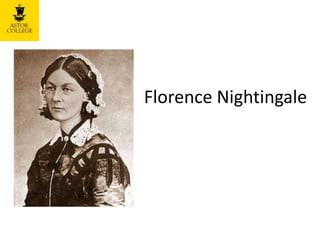 Florence Nightingale was born in 1820 in Italy to British parents. She felt called to nursing but her family disapproved. In 1851, she trained in Germany and in 1854 helped oversee nurses in the Crimean War, greatly improving conditions. She established nursing as a profession and the Nightingale Training School, helping develop modern nursing theories still used today.