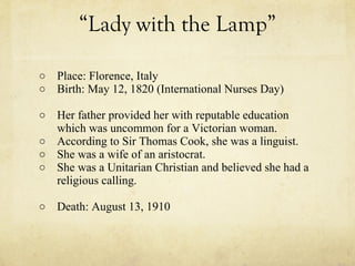 - Florence Nightingale was a pioneer of modern nursing who established the first nursing school in Germany and drastically improved care for soldiers during the Crimean War.