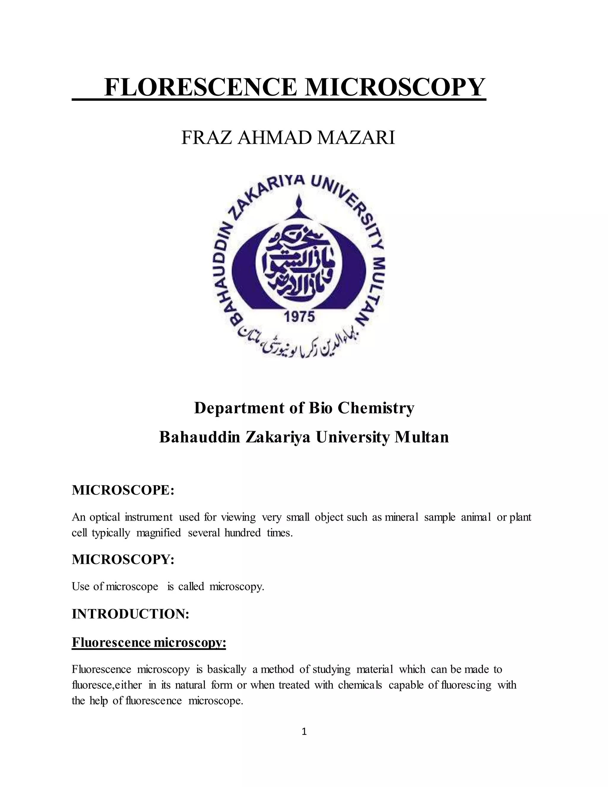 Fluorescence microscopy uses fluorescent dyes and high intensity light to illuminate samples and produce magnified images based on the emitted light from fluorophores rather than the illuminating light. There are several types of fluorescence microscopy including epifluorescence microscopy, confocal microscopy, two-photon excitation microscopy, and total internal reflection fluorescence microscopy. Epifluorescence microscopy is the most basic type and uses filter cubes to separate excitation and emission wavelengths. Confocal microscopy increases resolution by using a pinhole to reject out-of-focus light. Two-photon excitation microscopy penetrates deeper by using two lower energy photons simultaneously for excitation rather than one high energy photon. Total internal reflection fluorescence microscopy images fluorophores very close to a glass
