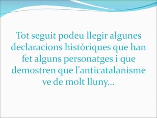 Floretes del espanyols 1. Algú pot entendre perquè els catalans s'entesten a parlar i pensar en català ? click per avançar 2. 3. Conde Duque de Olivares – 1625 (Primer ministre o favorit de Felip IV de Castella) 4. José Patiño – 1725 (Ministre de Felip V inspirador del Decret de Nova Planta) 5. 6. Manuel Azaña – 1934 (President de la II República Espanyola del 1936 al 1939) 7. General Queipo de Llano – 1938 (General espanyol protagonista del cop d'estat que va iniciar la Guerra Civil Espanyola) 8. 9. Luis Martinez de Galinsonga – 1968 (Director de La Vanguardia Española del 1939 al 1960) 10. 11. 12. 13. 14. José Prat - 1984 (Senador per Madrid entre el 1979, 1982 i 1986) 15. 16. José Rodríguez de la Borbolla - 1986 (President de la Junta d'Andalusia del 1986 al 1990) 17. 18. 19. Mercedes de la Merced – 1994 (Eurodiputada del Partit Popular del 1994 al 1999) 20. Txiqui Benegas – 2001 (Diputat del Partit Socialista Obrer Espanyol des del 1977) 21. Juan Carlos I – 2001 (Rei d'Espanya des del 22 de novembre de 1975) 22. 23. 24. Alfonso Guerra – 2006 (Diputat pel Partit Socialista Obrer Espanyol des del 1977) 25. 26. 27. Aquesta selecció de textos deixa ben palès que els hispans consideren la Nació Catalana una colònia i que en el seu país, Espanya , no se'ns ha perdut res als catalans. 28.