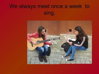 Flory and Despina meet once a week to sing together, where they often compose their own songs. Every Saturday they attend singing classes to improve their skills, and once a month they record cover songs to share on YouTube. Music is also part of their daily routine, as they listen to it once per day.