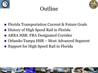 1) The document summarizes a presentation by FDOT Secretary Stephanie Kopelousos at a Federal Railroad Administration workshop on high speed and intercity passenger rail. 2) It outlines Florida's goals for transportation, including establishing a strategic intermodal system and developing a state rail plan. It also discusses Florida's history with high speed rail planning efforts dating back to 1974. 3) The presentation focuses on the federally designated Tampa-Orlando-Miami high speed rail corridor as the most advanced project in Florida, with the Orlando-Tampa segment being the furthest along with extensive planning, engineering, and environmental work completed.