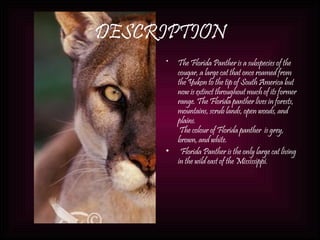 The Florida panther is a subspecies of cougar that is endangered, with only an estimated 30-50 individuals remaining in southern Florida. They live in forests, scrub lands, and plains. Many factors have threatened the panther, including loss of habitat, vehicle collisions, lack of prey, and health problems. Efforts are underway to protect panthers and help the population recover through habitat preservation, genetic restoration, and reintroducing captive-bred panthers to the wild.