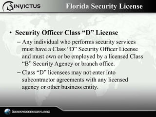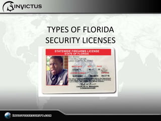 The document outlines various types of security licenses required in Florida, including the class 'D' security officer license, which is mandatory for individuals performing security services, and the class 'G' firearms license for carrying firearms while on duty. It also details the licensing requirements for security agencies, managers, instructors, and private investigators, specifying the conditions and restrictions for each type of license, including limitations on subcontracting. Each license serves a distinct purpose and is regulated to ensure compliance with Florida security laws.