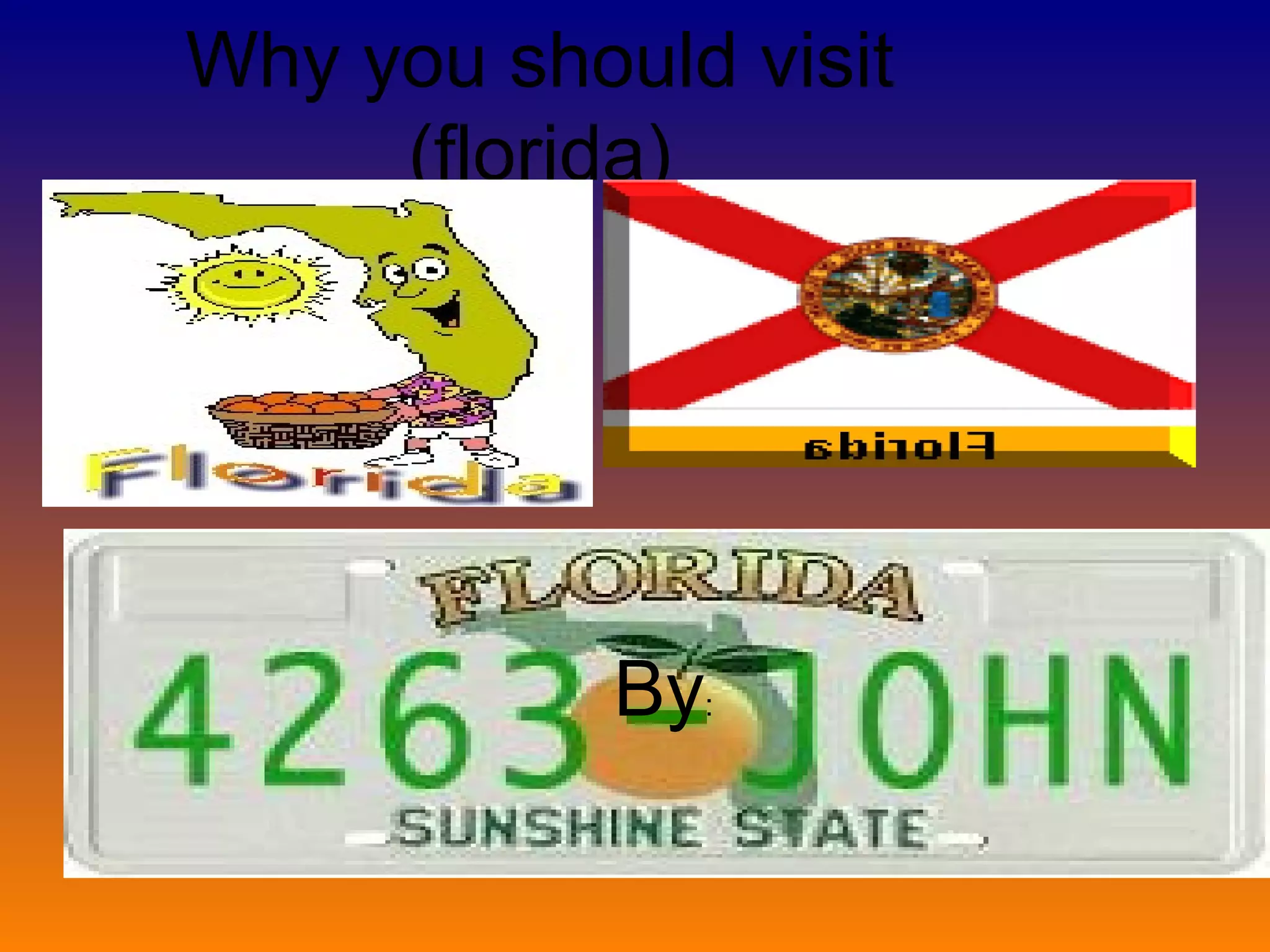 This document provides an overview of facts about Florida and reasons to visit the state. It lists Florida's nickname, bird, flower, and tree. It also discusses Florida's capital, population, year of statehood, and major ethnic groups. The document outlines Florida's key industries like tourism and agriculture, mentioning crops like citrus, sugarcane, and tomatoes. Finally, it briefly summarizes Florida's history from its earliest Native American inhabitants to becoming a US state in 1845 after being a territory and under colonial rule by Spain and Britain.